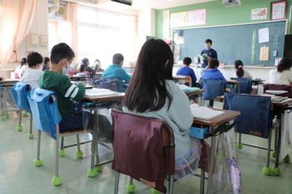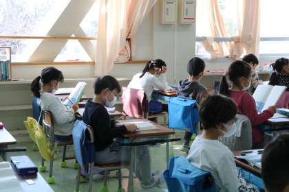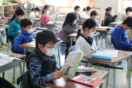 2年生国語「すーほの白い馬」の学習です。先生が読む声を聴きながら、教科書の字を追い、物語の世界にひきこまれています。