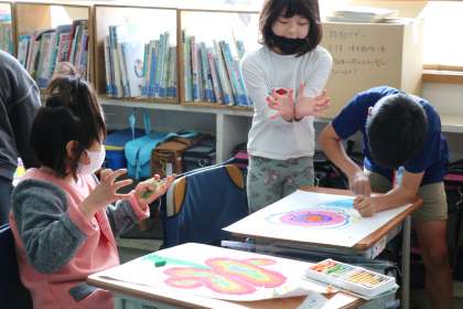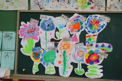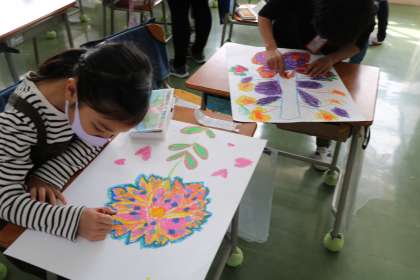 画用紙いっぱいにクレヨンで大きな花を描いています。新1年生のために描いているのだそうです。