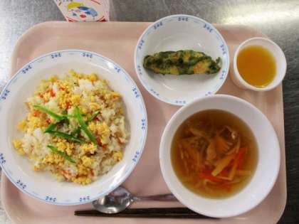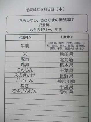 今日の給食はひなまつりの行事食です。3月3日は「桃の節句」とも「上巳の節句」ともよばれ、女の子の健やかな成長と幸せを願う日です。ひなまつりの行事食にはちらし寿司やはまぐりの潮汁、菱餅、ひなあられ、白酒などがあります。