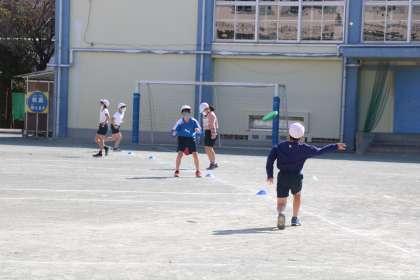 4年生体育「アルティメットフリスビー」の様子です。友達同士声をかけ合いながら、投げる時の体の使い方を教え合いながら取り組んでいます。