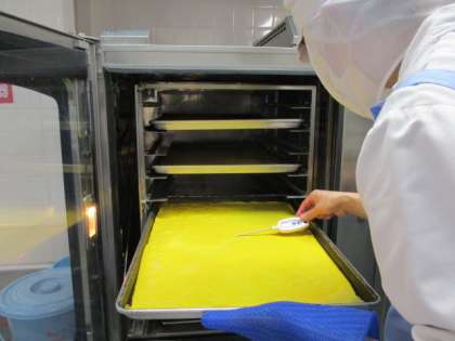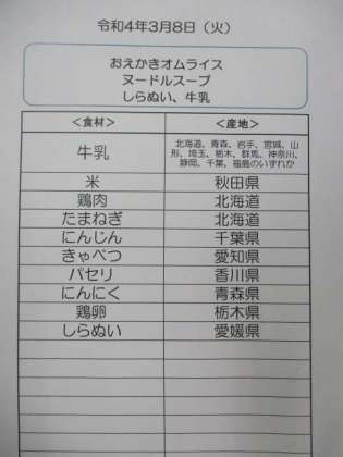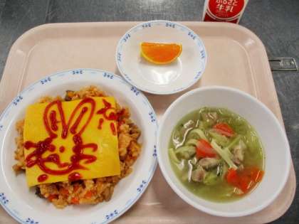 おえかきオムライスは、薄焼き卵の上にケチャップで自分で好きな絵をかけるようになっています。給食のサンプルのオムライスには、給食室の調理員さんがかわいい絵を描いてくれました。それを見たこどもたちは「わぁ〜!かわいい!」ととても喜んでいました。給食の時間には、静かに思い思いの絵をオムライスの上に描いていました。写真は薄焼き卵が焼き上がった様子です。大きな鉄板に卵液を流して、オーブンで焼いた後に切り分けて作りました。