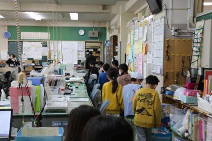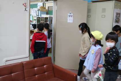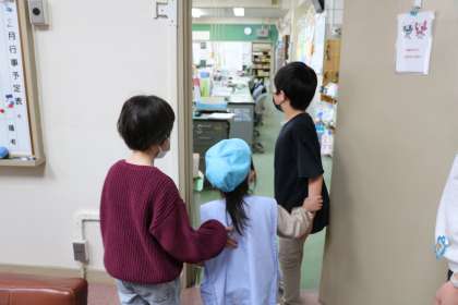 まず初めに、学校探検です。校長室から職員室に案内しています。