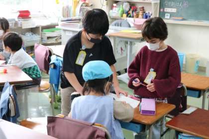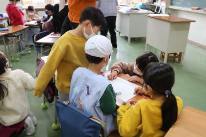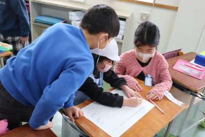 えんぴつで線を描いたり、絵を描いたり、幼稚園の子も上手です。優しく教えてあげる1年生もすてきなお兄さんお姉さんです。