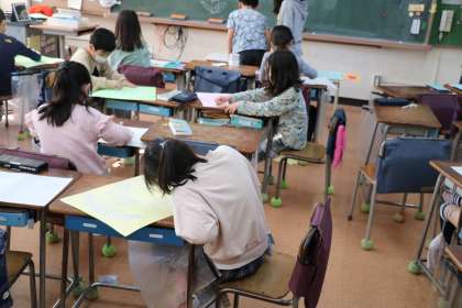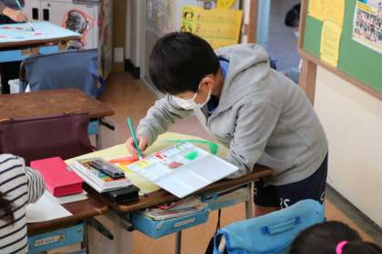 3年生の教室では、6年生を送る会で使う小道具を作っていました。6年生への感謝の思いを込めて花の絵をみんなで描いていました。どの子も一生懸命に取り組んでいました。