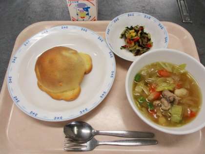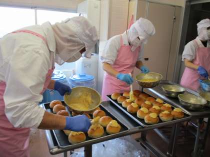 ビスキュイパンはパンの上に、手作りのビスケット生地をのせて焼いたものです。とても人気のある献立です。写真はビスキュイパンを作っている様子です。