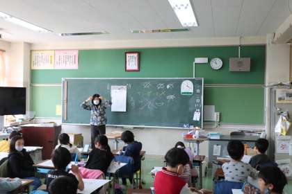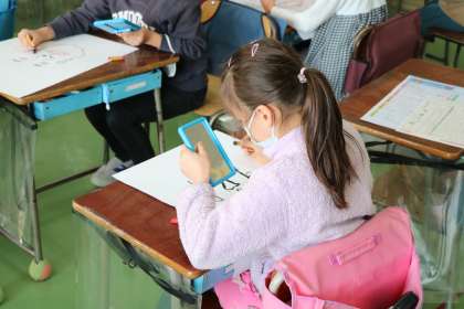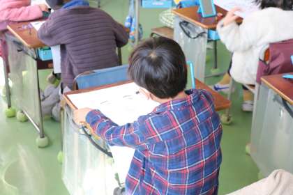 2年生の図工の授業です。自画像を描いていました。鏡で自分の顔をよく見て細かいところまで丁寧に描いていました。