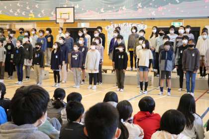 最後、5年生が入場すると6年生の拍手と「ヒュ〜」という歓迎の声が他の学年とは違います。ヒュ〜と文字で表すと何だか変ですが、何ともいえない6・5年生の絆を感じる温かい「ヒュ〜」なのです。5年生のメッセージと歌を真剣に聞く6年生でした。