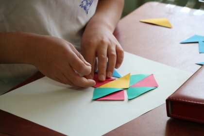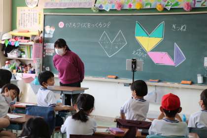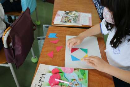 タイルを合わせて一つの形を作り、タイルを取り、さてどうやって組み合わせて作っているのでしょうか?と「かたちクイズ」にしたそうです。