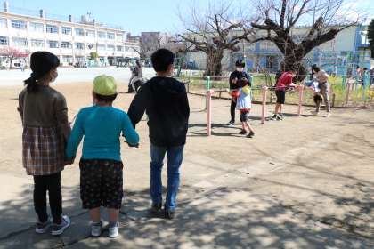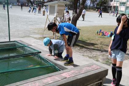池のコイを見たり、水分補給をしたり、校庭をお散歩したり、一人ひとりに合わせて楽しんでいます。