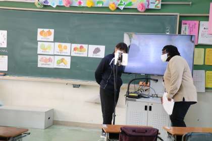 オンラインで外国語活動です。明日は学級閉鎖も解除です。