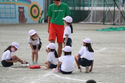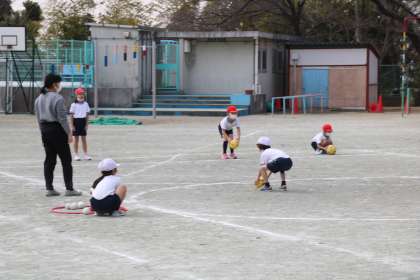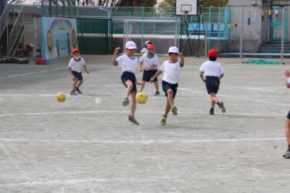 1年生の体育の様子です。ボール蹴りあそびでゲームをしていました。得点係が玉入れのボールを使って点数をカウントしています。自分たちでいろいろ分担してゲームを楽しむことができていました。