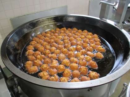今日はリクエスト給食です。給食のラーメンは、だしをとりがらからとって作っています。サーターアンダギーは小麦粉と黒砂糖を合わせて生地を作ってから油で揚げています。写真はサーターアンダギーを揚げているところです。