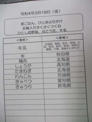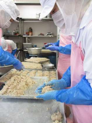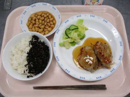 豆腐入りさくさくつくねは、きざんだれんこんが入っています。れんこんの歯触りがさくさくするので、この名前をつけました。上にはたれをかけています。低学年、中学年、高学年ごとに大きさを分けて、ひとり2個ずつ、全部で約1,100個作りました。