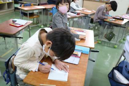 1年生生活科の様子です。1年間大切に育てたアサガオの種を、入学してくる1年生にも少しプレゼントしようと、封筒を作り手紙や絵を描いています。