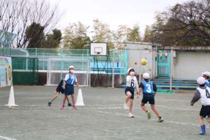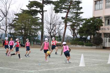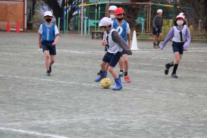 5年生体育ゴール型ゲーム「サッカー」の様子です。寒い中でしたが、子どもたちは動きがよく、互いに声をかけ合ってボールを追いかけています。