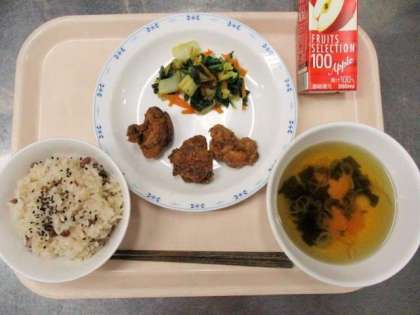 今日は今年度最後の給食でした。6年生の卒業をお祝いしてお赤飯にしました。