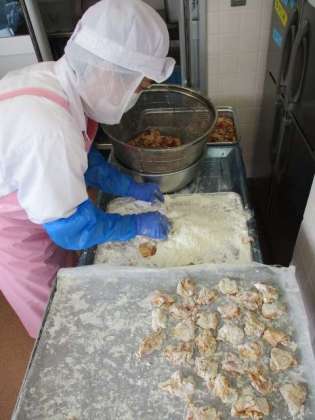 6年生のみなさんには砧小の思い出のひとつとして、卒業しても給食のことを思い出してくれたら嬉しいです。給食室も、毎日給食を完食してくれた元気で明るい6年生のことを忘れません。写真は下味をつけた鶏肉に小麦粉とかたくり粉をつけているところです。給食室で約1,500個分の唐揚げを揚げました。