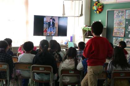 4年生が担任の、1年間の写真を編集して、先生が作った「お別れムービー」を見ている様子です。