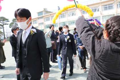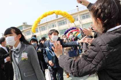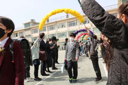 校庭に花道を作り、みんなで6年生を送りだしました。