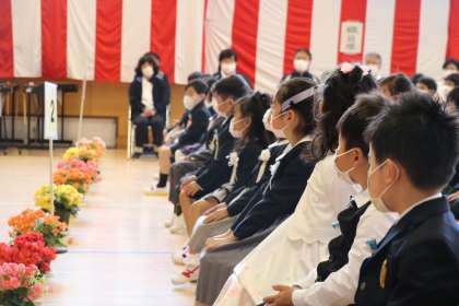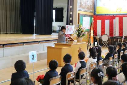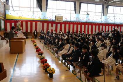 1年生はとってもお行儀がよく、話を聞くのが上手でした。そして、司会の先生の言葉をしっかり聞き立ったり、あいさつしたり、号令に合わせてさっと行動できるのが立派でした。後ろを向いて、お家の方々に写真を撮っていただいているときも少しも崩れないでしっかりとした姿勢でした。よく頑張りましたね!
