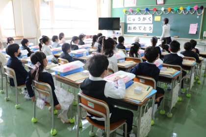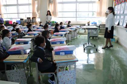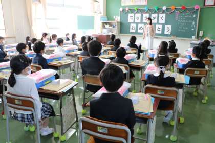 入学式の後の学級指導の様子です。入学式では緊張したことでしょう。教室では少しリラックスして元気に先生の質問に答えていました。