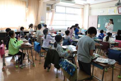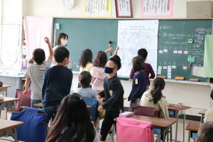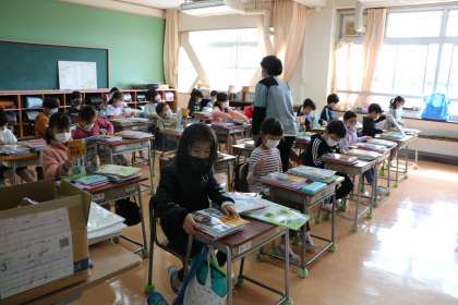 3年生の様子です。配られた教科書がたくさんあります。みんなで協力して教科書を配ったり、係の仕事を決めたり元気いっぱいの様子です。