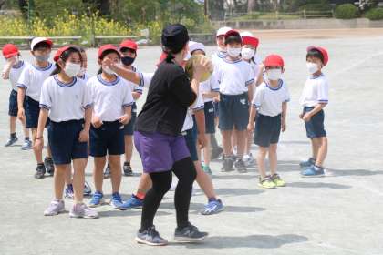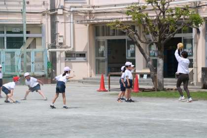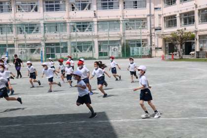 2年生の体育の授業です。暖かいというよりは暑いといった方がいいような天気です。子どもたちは、ボールを持った鬼を追いかけて、元気に体を動かしていました。