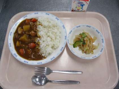今日から1年生から6年生まで全校一斉に給食が始まりました。最初の給食はカレーライスとこんにゃくサラダでしたが、どのクラスもよく食べていました。毎日、給食の献立と給食室の写真をホームページにのせていきますので、ぜひご覧になってください。今日の給食室の写真はカレーライスを作っているところです。