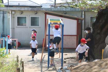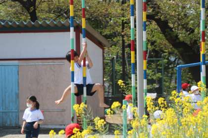 1年生の校庭体育の様子です。遊具の使って体つくりをしています。上り棒や雲梯などたくさんの遊具で楽しみながら活動していました。