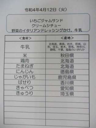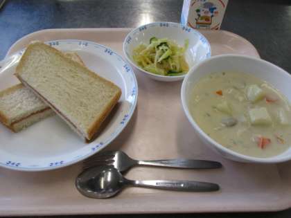 給食では、化学調味料等の添加物は使用せず、スープは鶏ガラ、だし汁は昆布や鰹節からとり、シチュー類のルーやコロッケ、ハンバーグ、デザートのゼリー類等、手作り調理を行っています。今日のシチューも、鶏ガラでスープをとり、小麦粉とバターでルウを作りました。こどもたちは給食のシチューが大好きで、今日もよく食べていました。