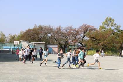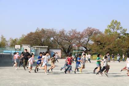 今朝は、5年生のランランランです。先生は走りながら全体に声をかけたり、励ましたりします。