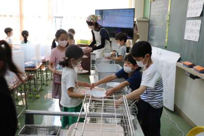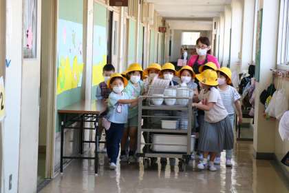 全員の食器の乗ったワゴンをリフトのところまで運び、トングやスプーンなどの置き場所を先生に教えてもらいます。最後に大きな声で「ごちそうさまでした!」とご挨拶をして、給食当番の仕事は終了です。みんなで協力して、とっても上手にできました。