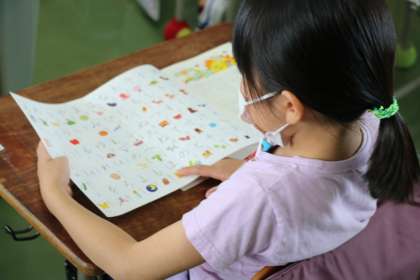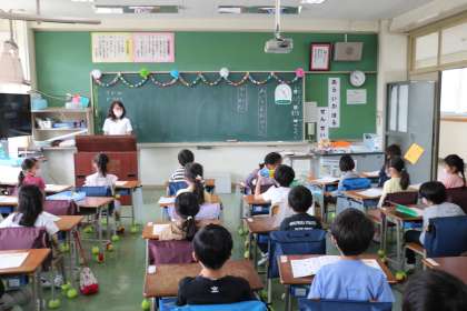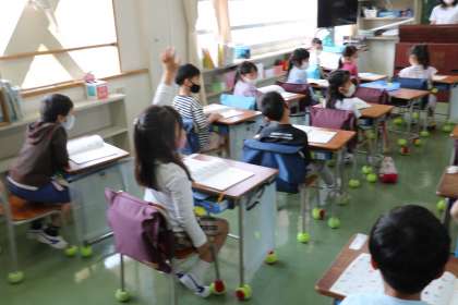 1年生の国語の授業です。オルガンの伴奏に合わせて声を出しながらひらがなの確認をしていました。しっかり声に出しながら覚えていきたいですね。