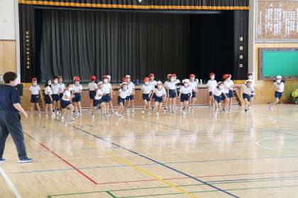 4年生の体育の授業です。大股で走ったり、スキップしたりといろいろな走り方を実践していました。どれも速く走るための基本的な動きになります。どの子も真剣に取り組んでいました。