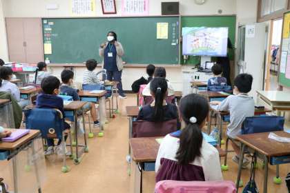 4年生外国語活動の様子です。先生が自己紹介をクイズ形式でしています。