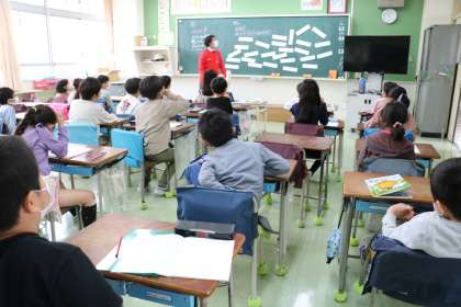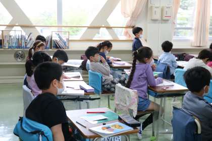 2年生算数「表とグラフ」の学習の様子です。生活科でやった野菜調べを活用して、簡単な表やグラフにまとめる学習です。実際の生活に役立つ内容に、子どもたちはとても意欲的に考え整理していきます。