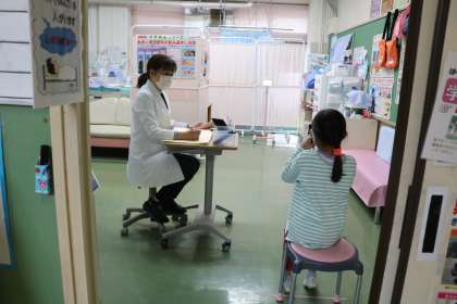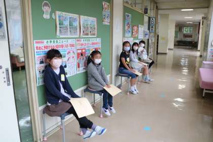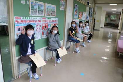 3年生視力検査の様子です。廊下で静かに順番を待っています。(どうしてもピースの写真も撮ってほしいとのことでしたので・・・)