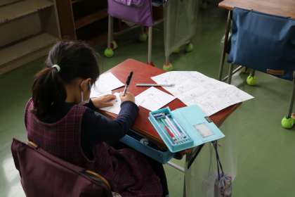 2年生の図工の授業です。「つづきえ どんどん」という作品に取り組んでいました。自分で決めた主人公が活躍する場面を6つつなげて、ストーリーのある絵を仕上げていました。どの子も楽しく活動できていました。