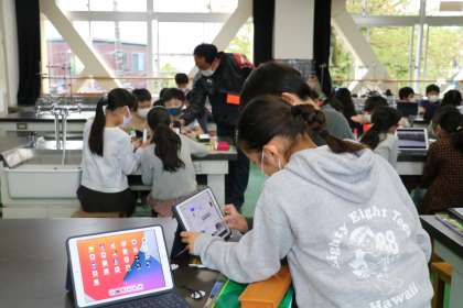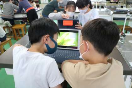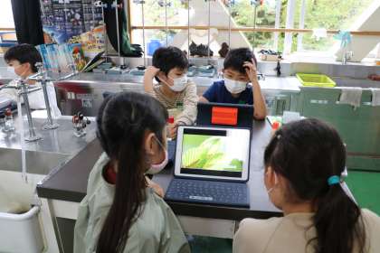 4年生理科の学習の様子です。春の植物の画像を見ながら、学習の見通しを立てています。