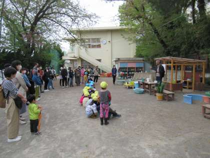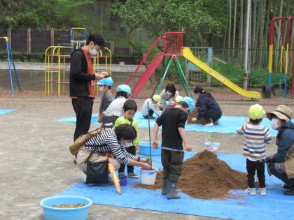 4月14日、野菜の先生の安藤さんと一緒に、「親子苗植え」をしました。親子で、自分の植木鉢に土を入れて、ピーマンとインゲン豆の苗から一つを選んで植えました。安藤さんにとても分かりやすく、やさしく教えていただきながら、苗の植え方を知ったり、土の感触を楽しんだり、野菜が大きく育つことを楽しみにしたりするひとときでした。これから、野菜の生長を親子で楽しみながら世話を続けていきます。