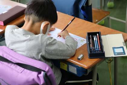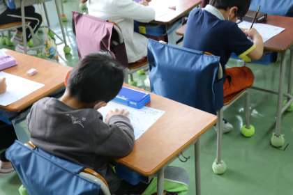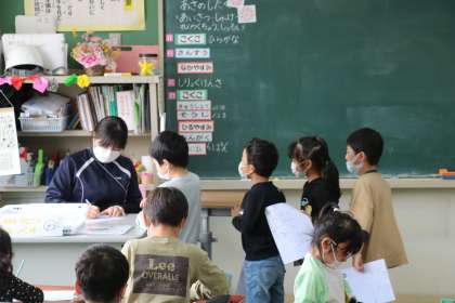 1年生の国語の授業です。ひらがなの学習でした。今日は「つ」の書き方を学習しました。先生と一緒に書き方のポイントを確認した後に、プリントで練習します。どの子も丁寧に書いていました。先生に見てもらってはなまるをもらっていました。