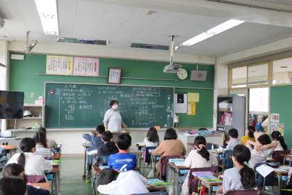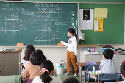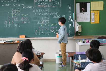 4年生の算数の授業です。大きなかけ算の学習をしていました。自分の考えを前に出てみんなに説明する場面もありました。自分の言葉でわかりやすく説明できていました。