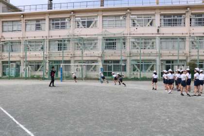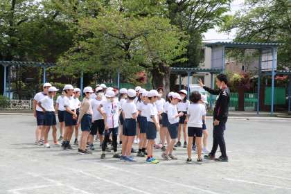 5年生体育の様子です。先週90メートルのタイムを測りました。今日は、さらに速く走るためのコツを教えてもらい練習です。コツはなあに?と子どもたちに聞くと