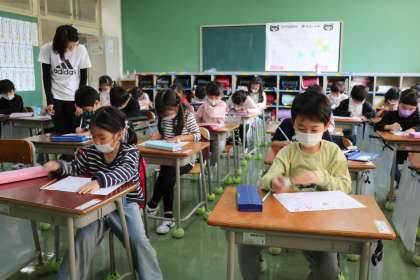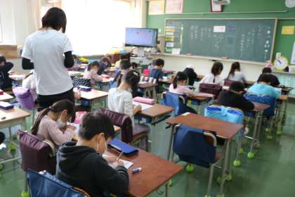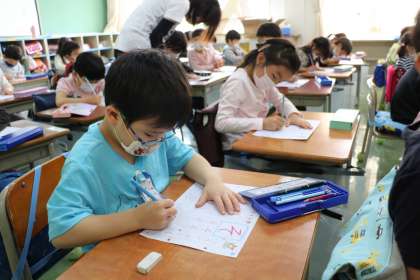 1年生国語の学習の様子です。ひらがなの「そ」を練習しました。先生がたのしくクイズのように「そ」のつく言葉を出していくと、だんだん今日学習するひらがながわかってきます。