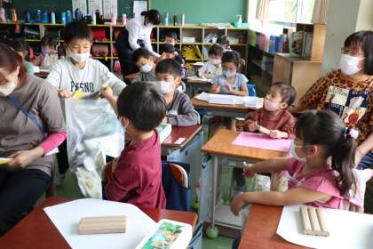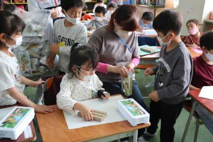 1年生図工、粘土あそびの様子です。袋から出して新しい粘土に嬉しそうです。