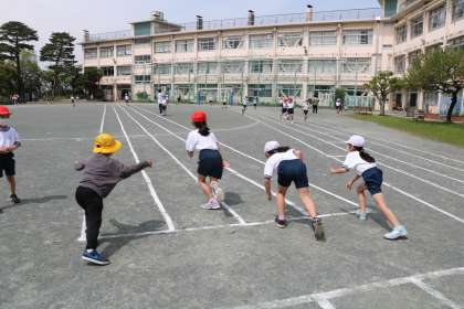 2年生のお姉さんたちが、50メートルのコースを見てかけっこをやろうとスタート位置に並びました。