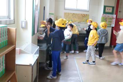 朝遊びが終わって教室に戻る前に、うがいと手洗いを忘れない2年生です。