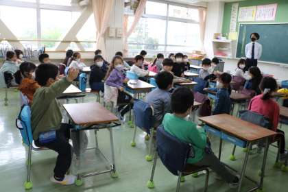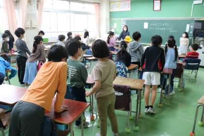 2年生の朝の会が始まります。日直が司会をやったり、ハンカチ・ちり紙検査をしたり、出席を取るとき一人一言発表したり、それぞれクラスによって工夫した朝の会です。