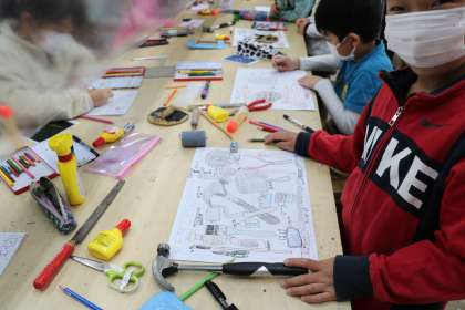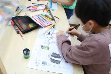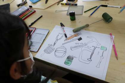 3年生図工「図工図鑑」の様子です。先週の鉛筆書きからだいぶ完成に近づいてきました。