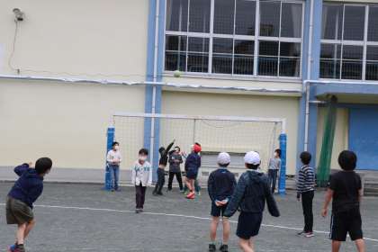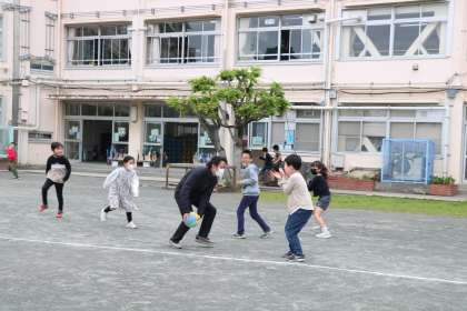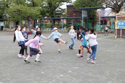 砧小学校の特色のひとつに、休み時間は校庭で先生と一緒に遊ぶ「共遊び」があります。私は、健康・体力づくりの原点は外遊びであるとも考えています。今日も多くの先生が子どもたちと一緒に遊んでいます!